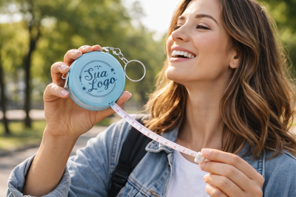 A principal força da fita métrica está na sua funcionalidade. Diferente de brindes puramente decorativos, ela resolve um problema prático imediato: medir algo rapidamente, sem precisar procurar ferramentas maiores ou aplicativos.